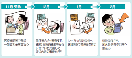 償還金の払い戻される時期について通常の場合は、診療を受けた3ヵ月後に戻ってきます。(下図参照)ただし、高額療養費に該当する場合は、先に高額療養費を支給(通常、診療を受けた6ヵ 月後。申請手続きが必要です。)してから償還金が払い戻されます。 また、医療機関等からの請求が遅れた場合などは、償還金の払い戻しも遅れます。 償還金振込後、償還金が1,000円を超えた場合は「償還金支給決定通知書」により、明細をお知らせしています。 受診から振込までのながれ(例)